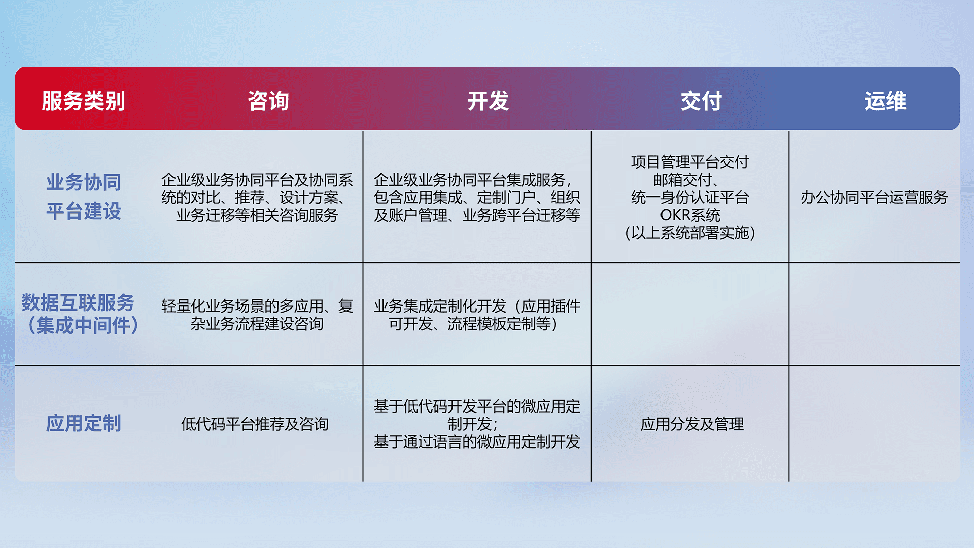 针对钉钉、、企微、、、IDaas等平台级产品提供产品的规划、、方案、、、、交付、、定制化开发等服务,,,,实现如统一协同办公、、智能客户服务、、混合会议管理、、、、智能数据查询、、、、等业务场景,,,,实现数字化转型。。。